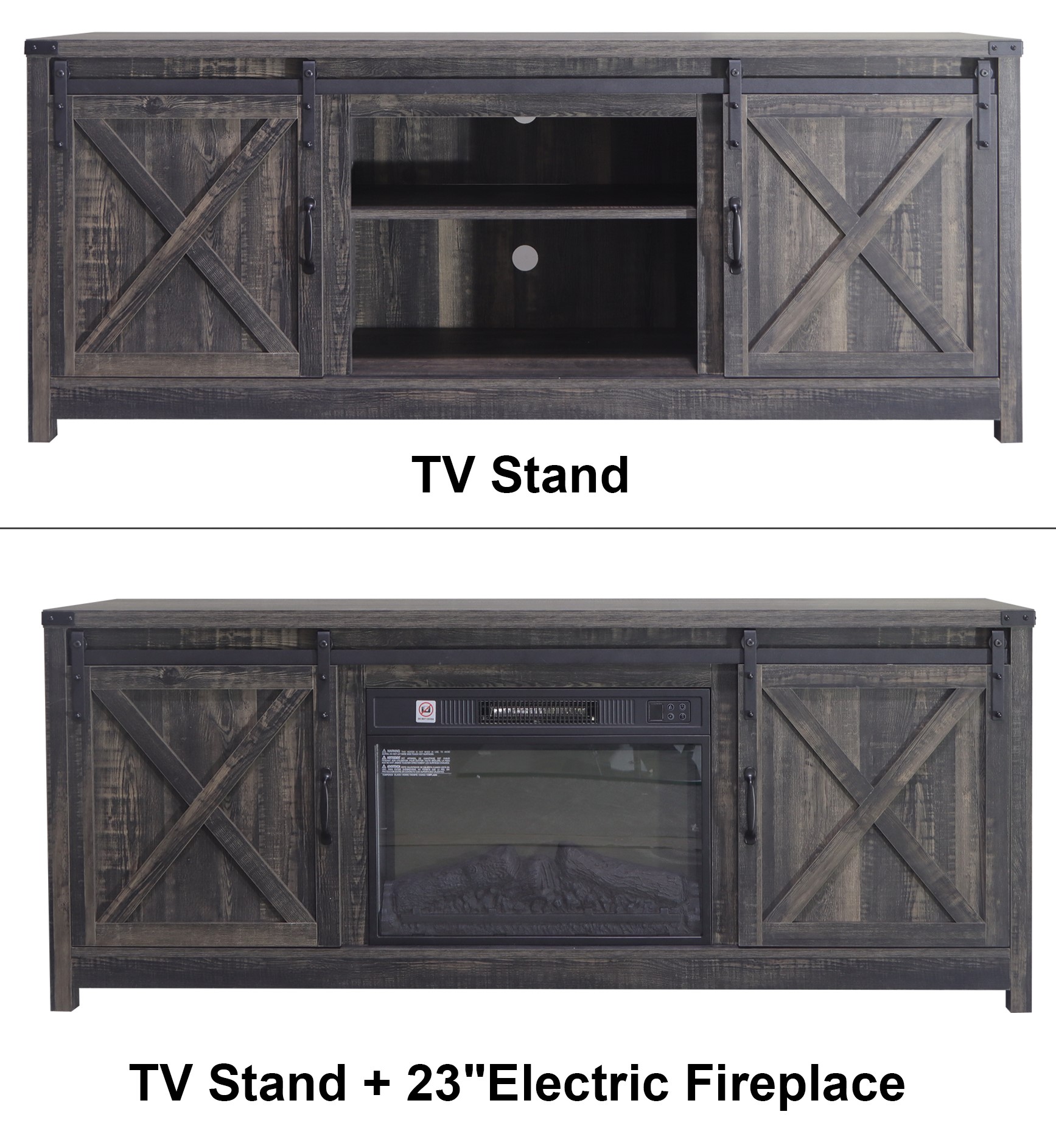 Ancaster TV stand with barn doors, storage, cable management. Available with or without fireplace insert.