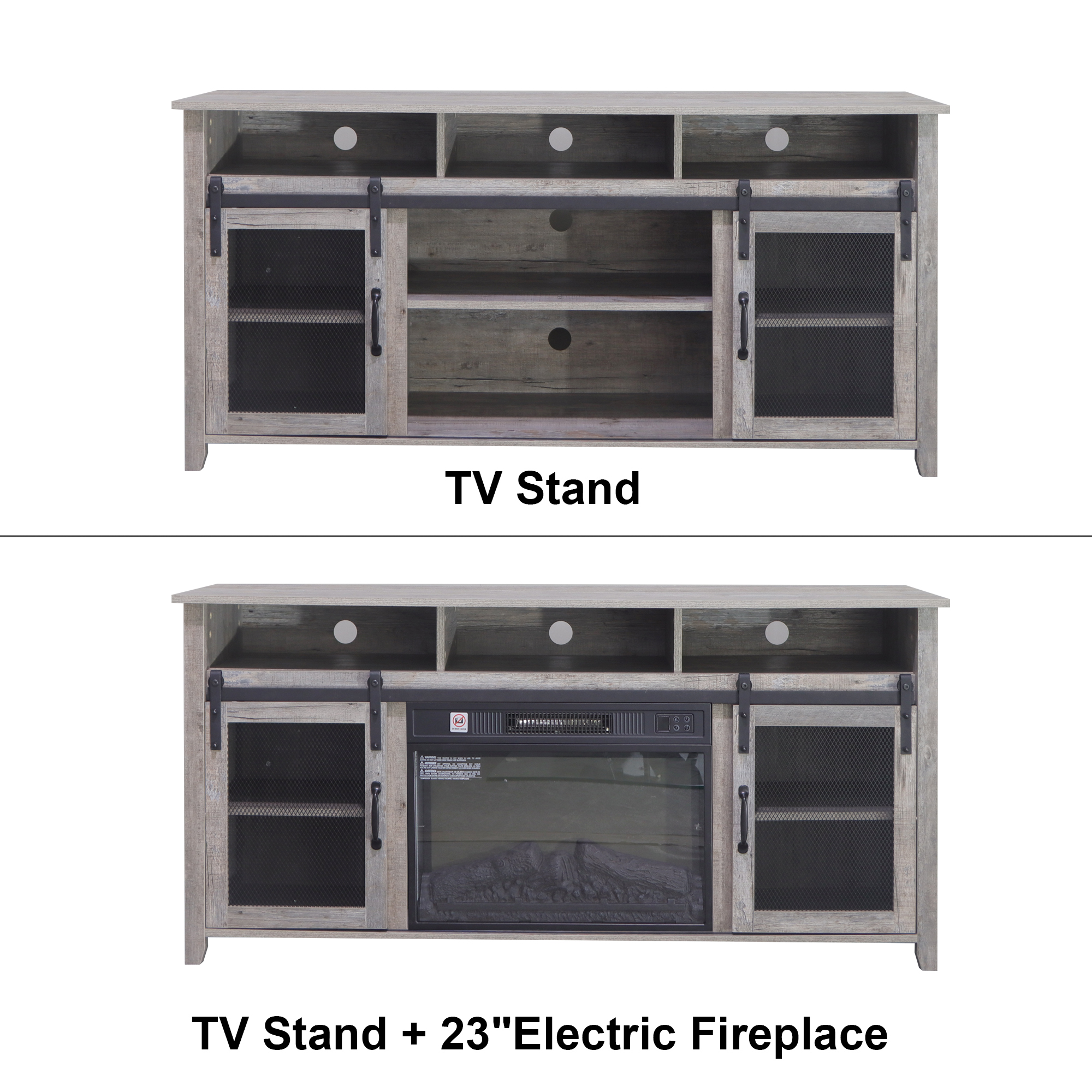 Aspen TV stand with steel mesh barn doors, storage, cable management. Available with or without fireplace insert.