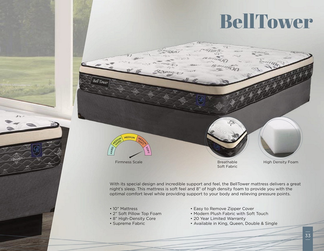 With its special design and incredible support and feel, the BellTower mattress delivers a great night’s sleep. This mattress is soft feel and 8” of high density foam to provide you with the optimal comfort level while providing support to your body and relieving pressure points.