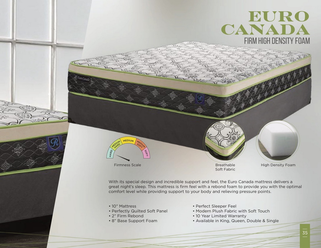 With its special design and incredible support and feel, the Euro Canada mattress delivers a great night’s sleep. This mattress is firm feel with a rebond foam to provide you with the optimal comfort level while providing support to your body and relieving pressure points.