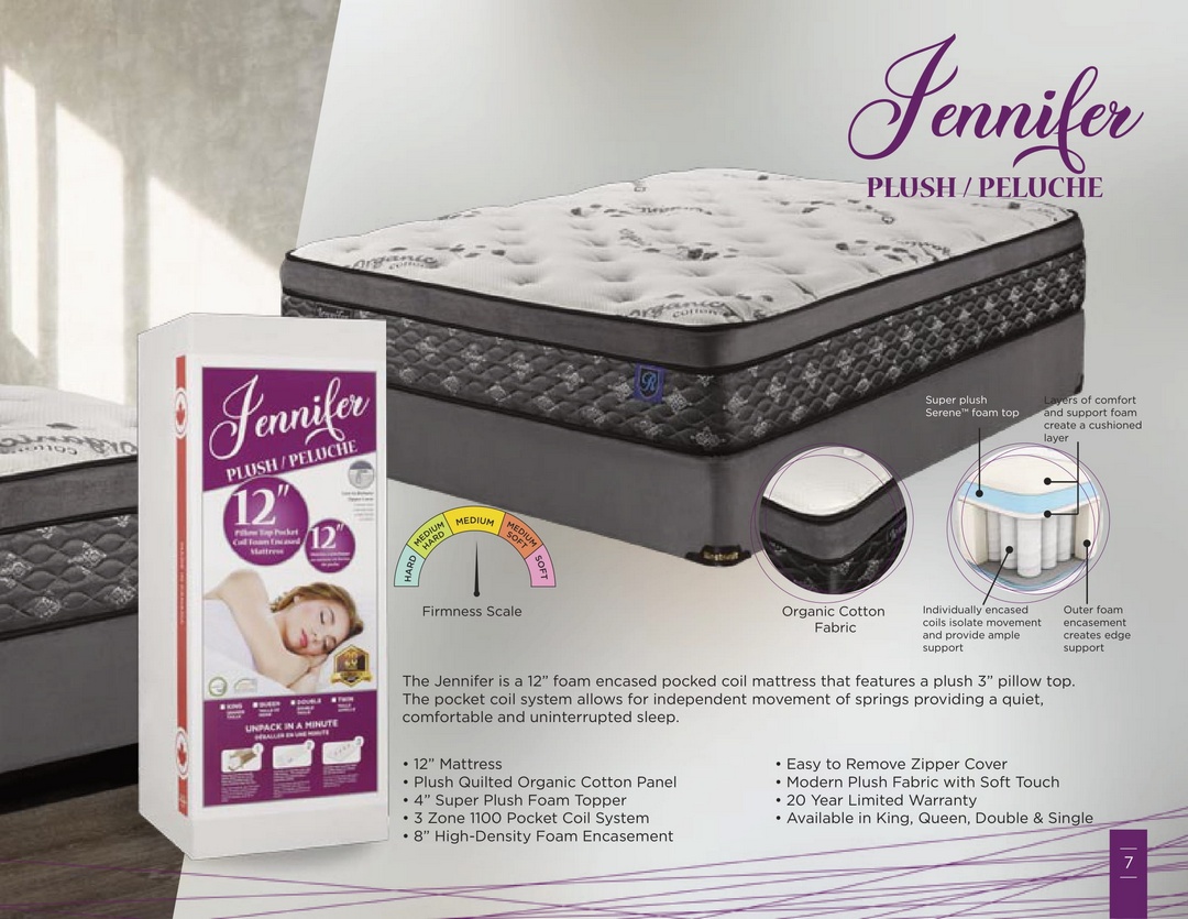 The Jennifer is a 12” foam encased pocked coil mattress that features a plush 3” pillow top. The pocket coil system allows for independent movement of springs providing a quiet, comfortable and uninterrupted sleep.