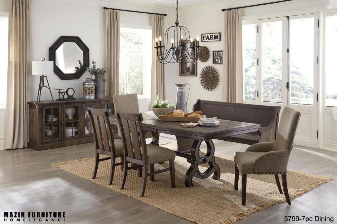 With styling that hints at times gone past, the Gloversville Collection’s stately presence will be the perfect addition to your dining room. The pine solids of the 86-inch table are supported by a distinct trestle base, its curves providing bold accent to the table’s top. The upholstered armchair is complemented by the wood framed side chair, each featuring a neutral toned fabric and nailhead accent. The wood bench takes design inspiration from old-fashioned church pews, its curved arms giving way to the unfettered seating.