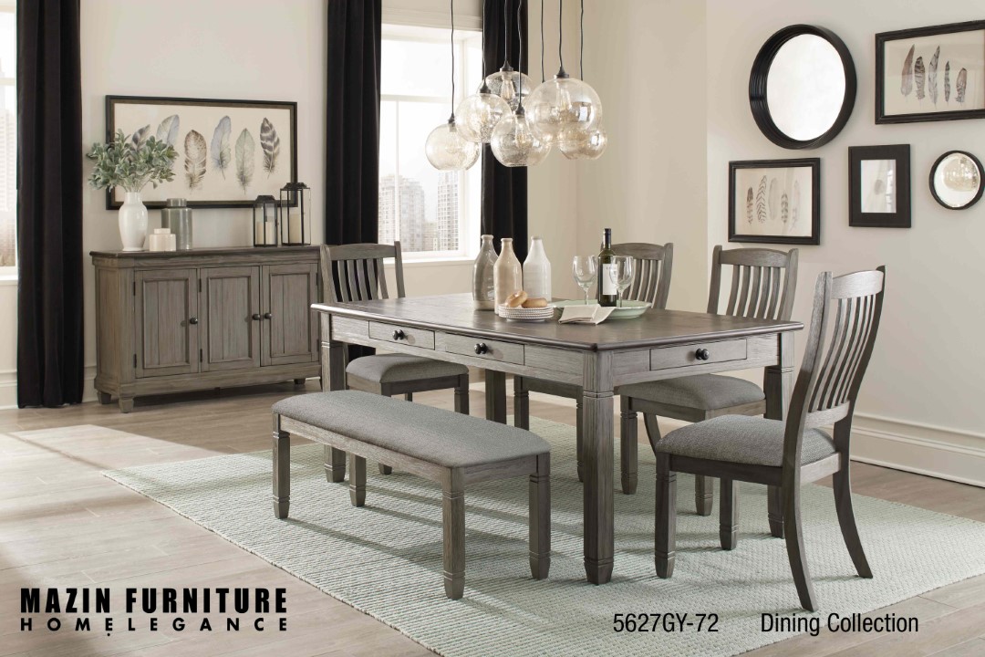 Inspired by the aesthetic of a casual country kitchen, the Granby Collection is an inviting gathering spot for mealtime with family and friends. A two-tone finish of the dining height table presents as a harmonious combination of color. The gray fabric seat complements antique gray finished side chair frame. 6-drawer on table apron and a 3-door server provide ample space in which to store your tabletop accessories.