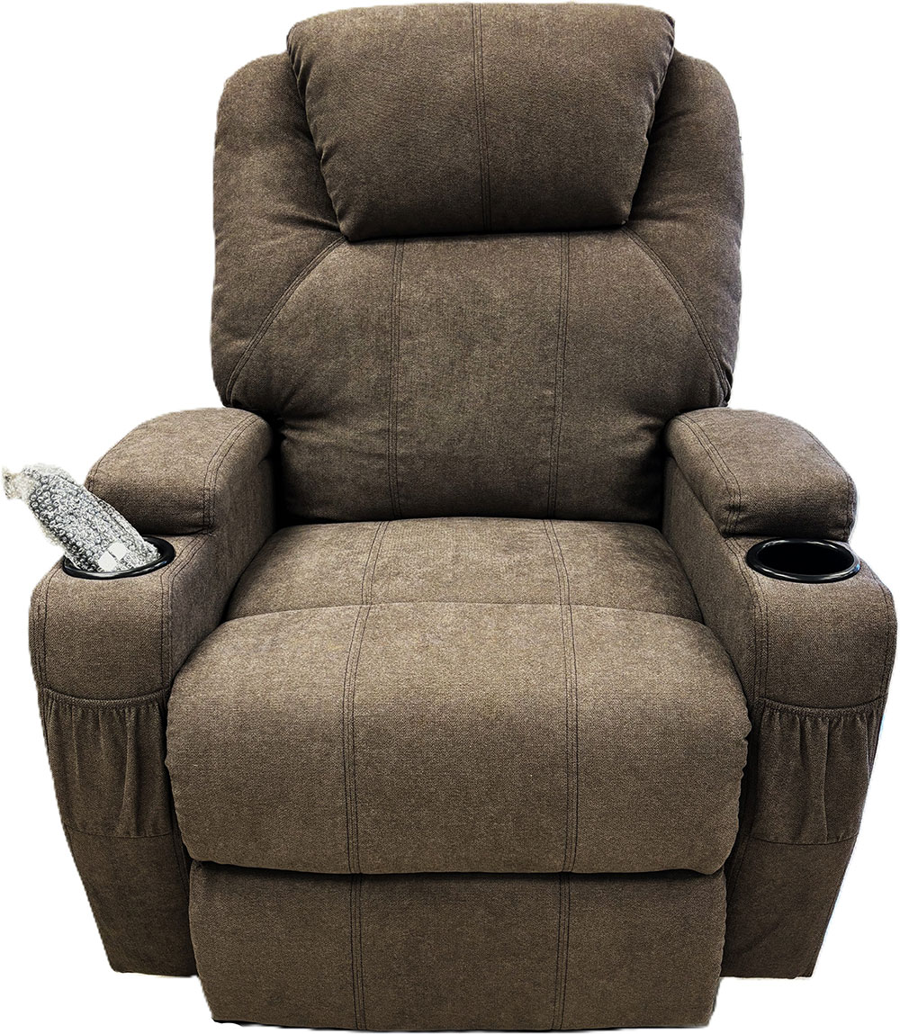 Model 7028 power single motor lift, rocker recliner with cup holders in arm rests. Available in brown cloth.