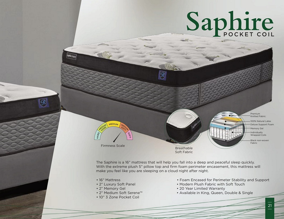 The Saphire is a 16” mattress that will help you fall into a deep and peaceful sleep quickly. With the extreme plush 5” pillow top and firm foam perimeter encasement, this mattress will make you feel like you are sleeping on a cloud night after night.