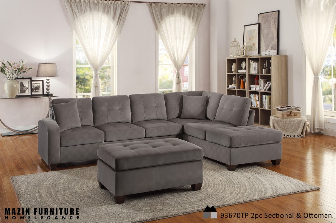 Fall deep into relaxation with the Caulfield self-assembly collection. This fully reversible sectional features an end chaise with side cushion that allows you to sit, or turn and stretch out to get seriously comfortable. The coordinating ottoman is firm enough both to act as auxiliary seating as well as to support a serving tray, and large enough to give everyone the space to put up their feet and relax. Tufted seat and back cushions in a soft neutral taupe fabric with matching toss pillows complete this contemporary design. Also available in chocolate brown fabric.