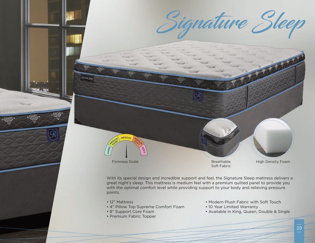 With its special design and incredible support and feel, the Signature Sleep mattress delivers a great night’s sleep. This mattress is medium feel with a premium quilted panel to provide you with the optimal comfort level while providing support to your body and relieving pressure points.